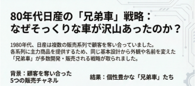 1. 1980年代、日産が仕掛けた「多チャンネル時代の熱狂」 1980年代から90年代にかけて、日本の自動車市場は「兄弟車」の黄金時代を迎えました。特に日産は、トヨタなどと同様に複数の販売チャンネル(ディーラー系列)を持っており、それぞれの店舗に供給... -