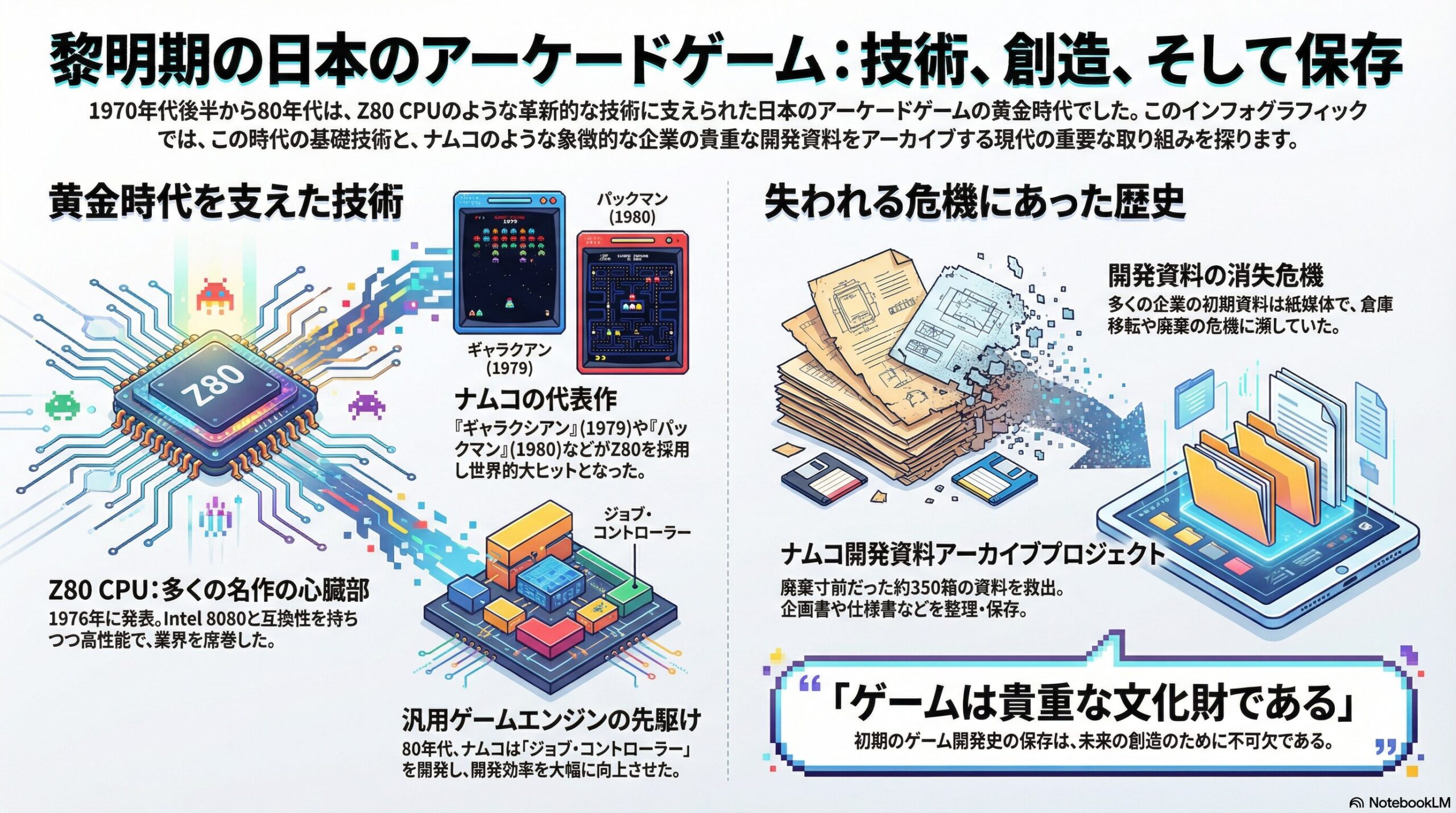 かつて世界を席巻した日本のビデオゲーム。その爆発的な進化の裏には、革新的なマイクロプロセッサの登場と、開発者たちの飽くなき情熱、そしてそれらの歴史を「文化」として守ろうとする現代の活動があります。 1. 技術的ブレイクスルー:Z80プロセッサと...