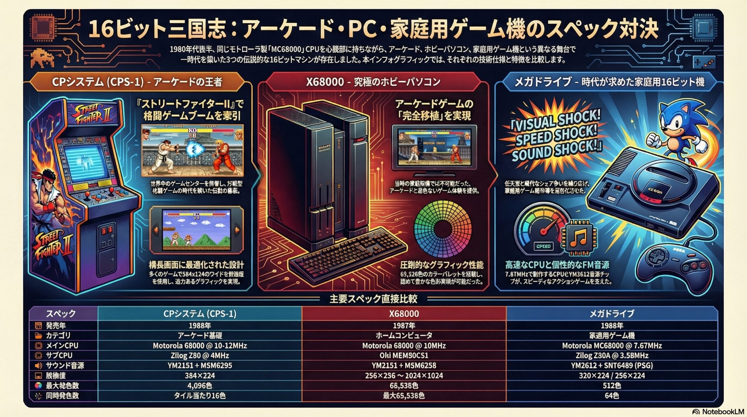 1980年代後半から90年代にかけて、ゲーム業界にはハードウェアの進化による巨大な技術革新の波が押し寄せました。今回のブログでは、当時のファンを熱狂させた伝説のハードウェア――CPシステム、メガドライブ、X68000、そしてNeo-Geo――の技術的な舞台裏と、... -